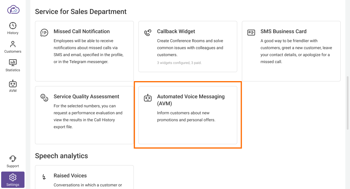 2. In the Service for Sales Department section, select Automated Voice Messaging (AVM).