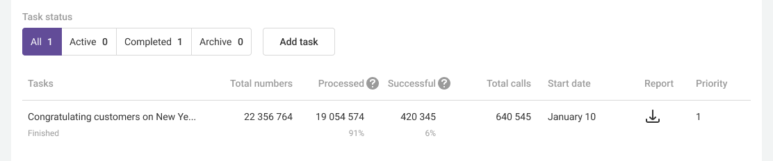 The priority will affect how calls are distributed between tasks: Cloud PBX will make more calls with priority 1 and fewer calls with priority 5.