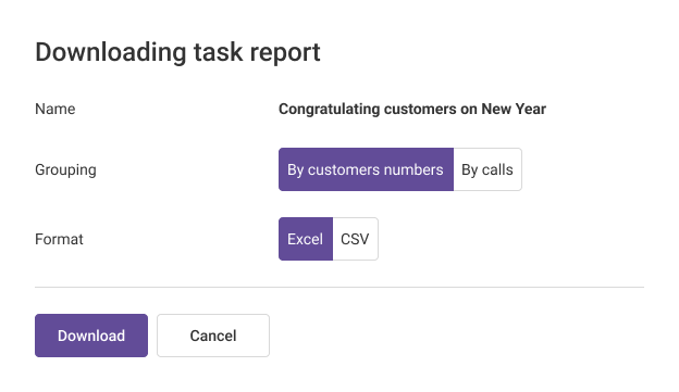 In the appeared window select how to group the data in the report (by customer numbers or by calls), and the format of the downloaded file.