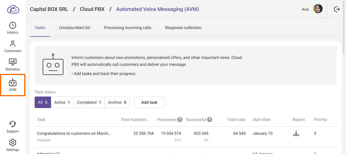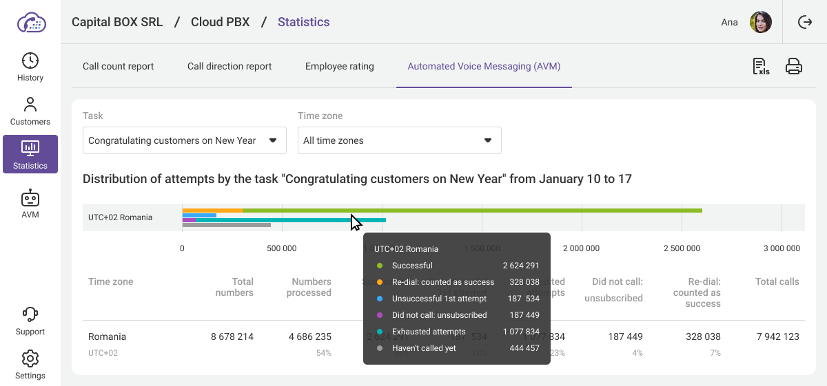 • set up the AVM mode (Cloud PBX will call numbers from the list on the specified days of the week and hours, considering the time zone in which the customer is located — your call will not wake the customer up and will not cause them inconvenience).