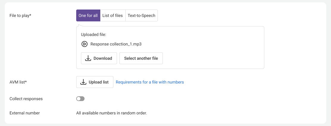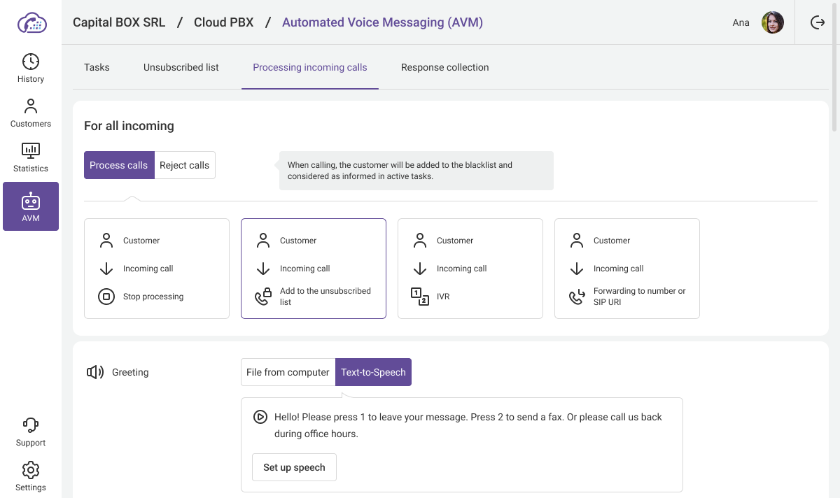 If you do not set up call forwarding to an external number or SIP URI, then add a voice greeting for your customers. Thus, when calling the AVM number, customers will be able to choose further actions in the IVR themselves or make sure that Cloud PBX will not call them again if the number is automatically added to the unsubscribed list f during the call. You can upload your audio file or use Text-to-Speech.
