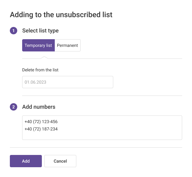 Select how long you want numbers to remain on the exclusion list (temporarily or permanently) and enter one or more numbers in the 49ХХХХХХХХХХ format.