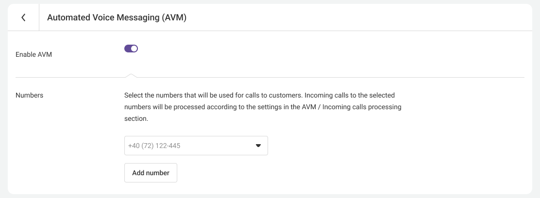 3. Enable the feature by moving the switch to the right and select the numbers from which AVM calls will be made. Click Save.