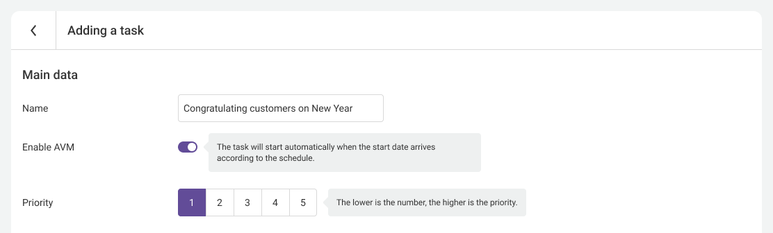 6. Enter the name of the AVM task. The name should be so that you can easily find it in the general list.