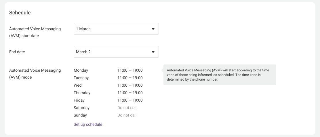 The AVM will begin at the time you specify, considering the customers’ time zone, which Cloud PBX will determine by the phone number. If Cloud PBX will be unable to determine the time zone, the AVM will not be provided to this number.