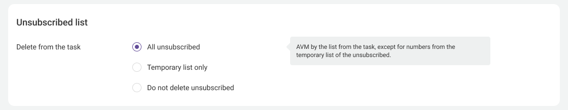 By default, all customers added to the unsubscribed list are excluded from the task. If you need to exclude customer numbers only from the temporary list or notify all customers, select the appropriate option.