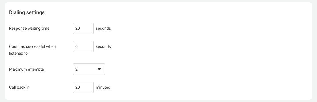 14. Specify how Cloud PBX will call a customer: how many seconds to wait for an answer, how many attempts to make to get through, and after how many minutes to call again. Set the listening time after which the call will be considered successful. If the customer hangs up earlier, the call will not be considered successful, and Cloud PBX will try to call again after the specified time interval.