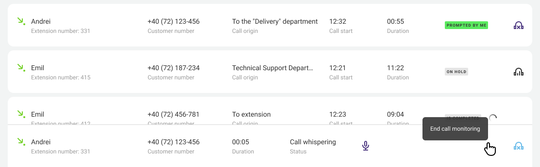To find out which employees are currently talking on the phone and with whom they are talking, go to the Call Whispering tab and select a call with the headphone icon on the right.