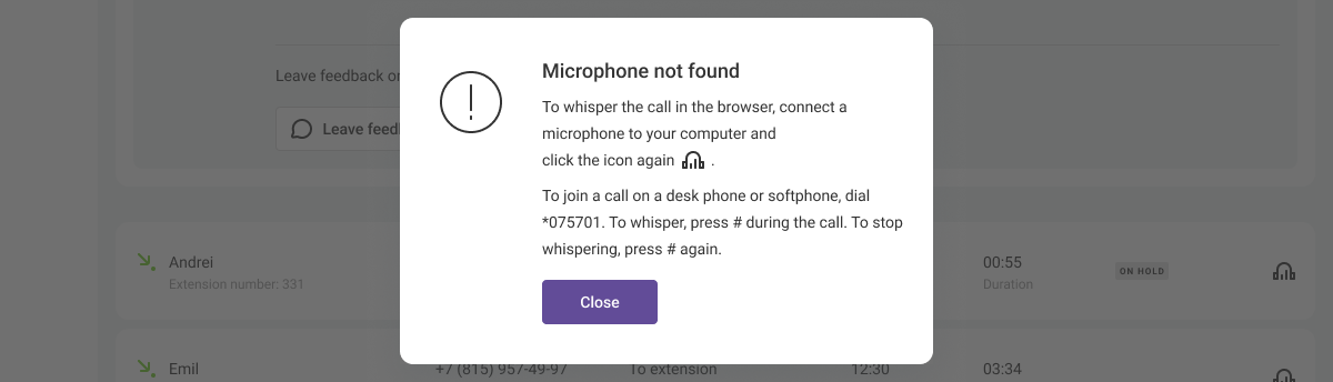Please note: you can listen to and whisper a call through the interface only after connecting a microphone to your computer. Otherwise, when you click the headphones icon, the following notification will appear: