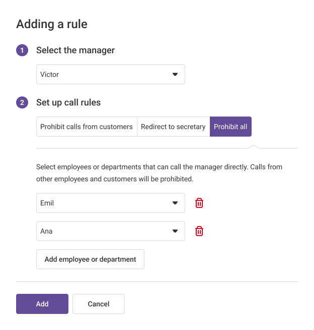 4. When you have set up the rule for restricting calls to the manager, click Add. Check the added restrictions — if you need to edit them, click on the gear icon. If a rule becomes irrelevant, you can delete it by clicking the trash can icon.