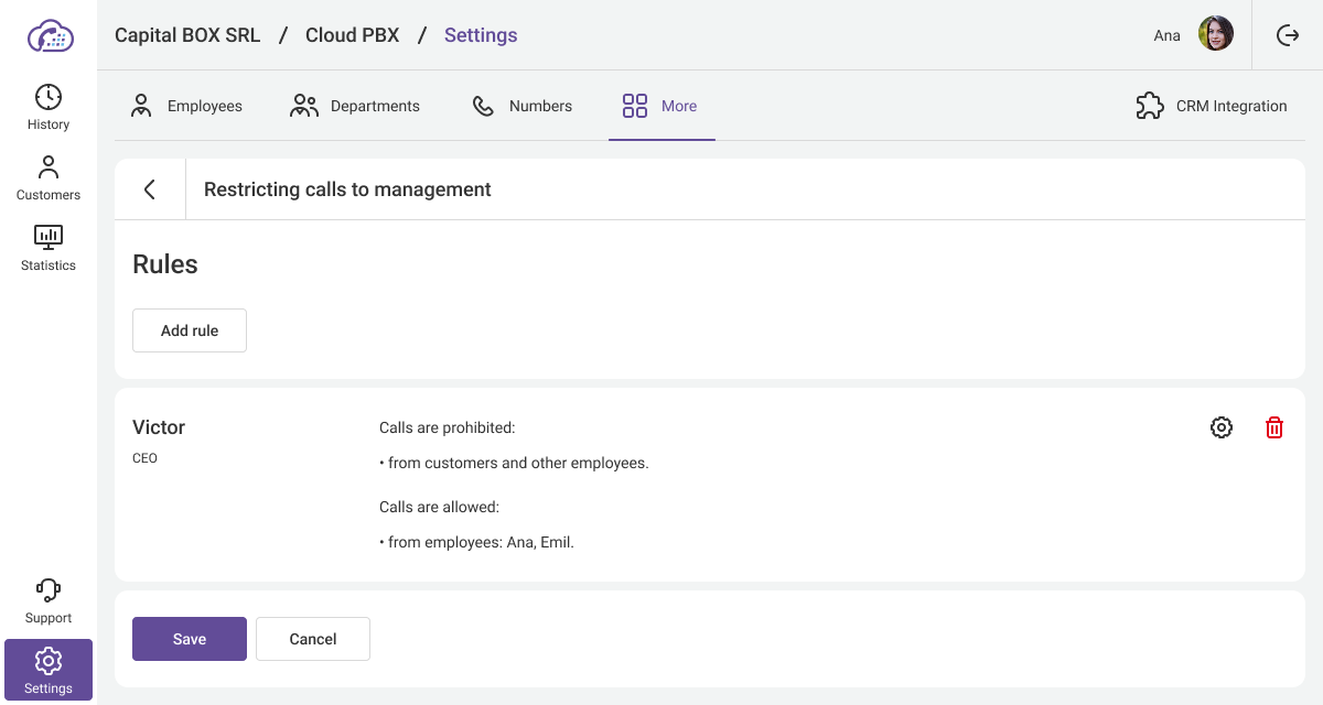 - Prohibit calls from customers — only employees will be able to call the manager via Cloud PBX. This is the default option.