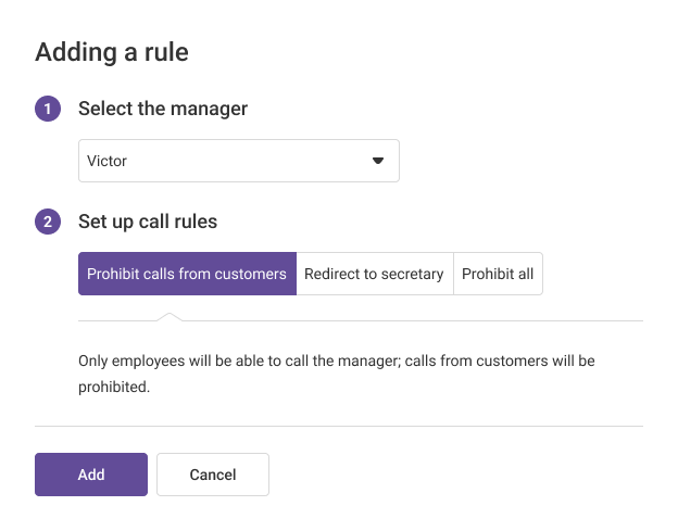 Done! Now, when trying to call the manager, all employees and customers who are prohibited from calling the management will hear the “Calls to this number are prohibited.” notification After the notification is played, Cloud PBX will automatically hang up the call.