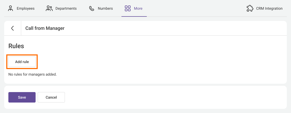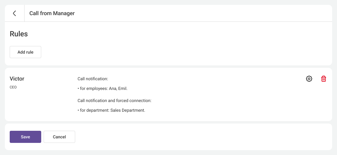 Select an employee for the enforced connection to the manager upon a call. With this setup option, the employee will first hear the “The manager is calling“ notification, and, after 5 seconds, Cloud PBX will connect them to this manager. At the same time, Cloud PBX will put their current call on hold. During these 5 seconds, the employee can warn the other person about the call from the manager and ask them to wait on the line.