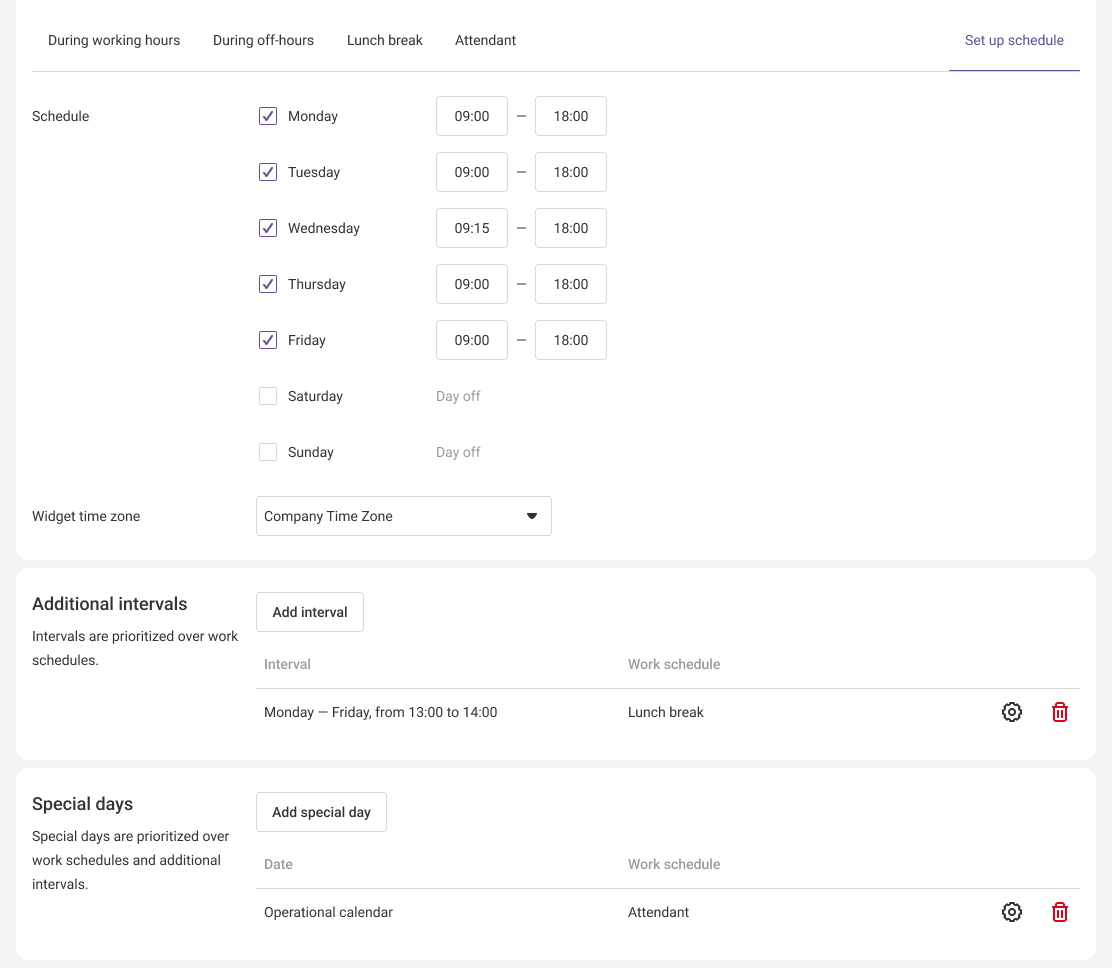The widget schedule settings have the same capabilities as the number schedule settings. Therefore, to customize the widget according to your schedule, we recommend that you read the Flexible schedule settings for a number article.
