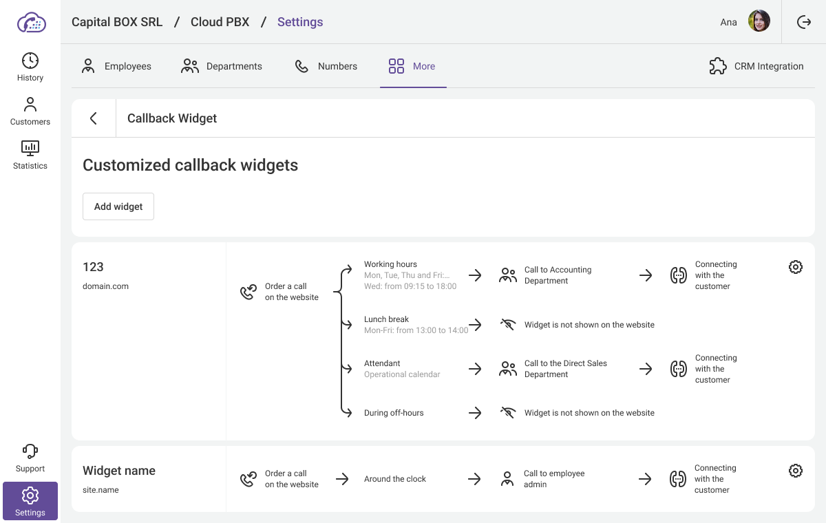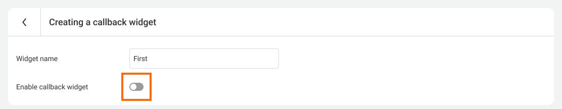 In the appeared window at the bottom of the page click Add widget. Next, you will be taken to the window for creating a callback widget. Specify any widget name and turn on the Enable callback widget switch to open its settings.