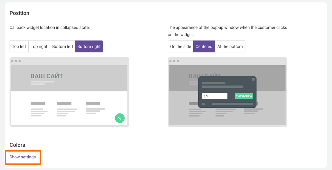 Choose the color for the call request button, the background of the pop-up window and the text inside it. You can choose colors to match your corporate style or make the widget stand out on your website pages.