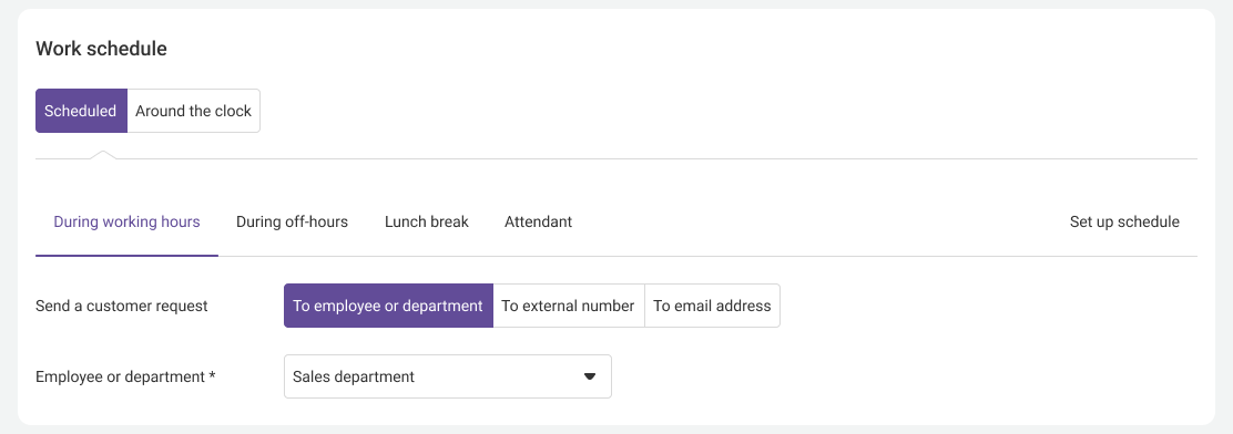 3. Specify the schedule for your managers to receive calls during working and non-working hours. Select employees or departments to answer calls requested through the callback widget.