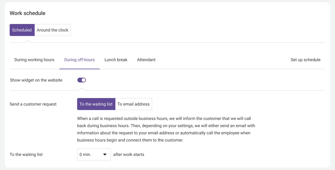 4. Set up the work of the callback widget during off-hours. Even if all your employees have a day off, the widget will continue to collect numbers of clients who want to receive a callback. If a website visitor orders a call during off-hours, the widget will inform them about the date and time when your employee will reach out.