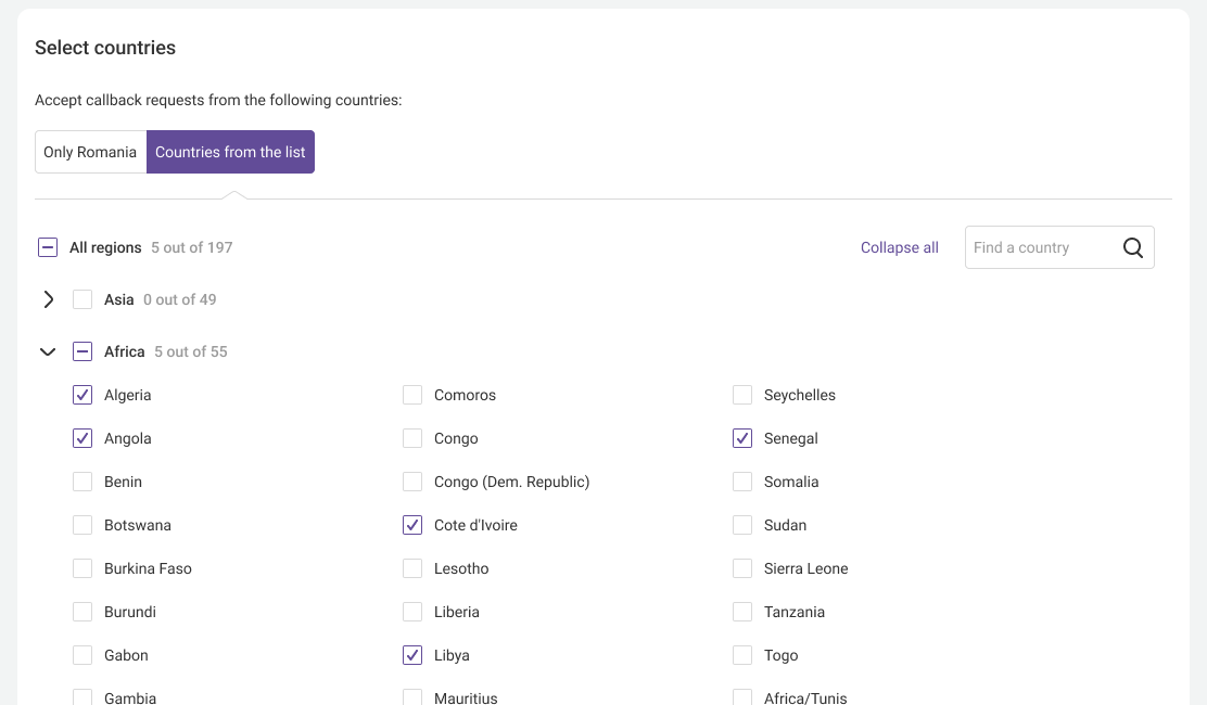 6. Specify the customers from which countries can request a callback from your website. If a user from a country outside your company's service area tries to request a callback, Cloud PBX will notify you as soon as the customer enters the phone number in the widget.