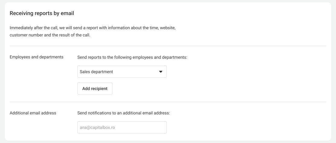 8. You can receive reports on each call requested using the callback widget. To do this, select which of the employees (or departments) your Cloud PBX will send these reports to.