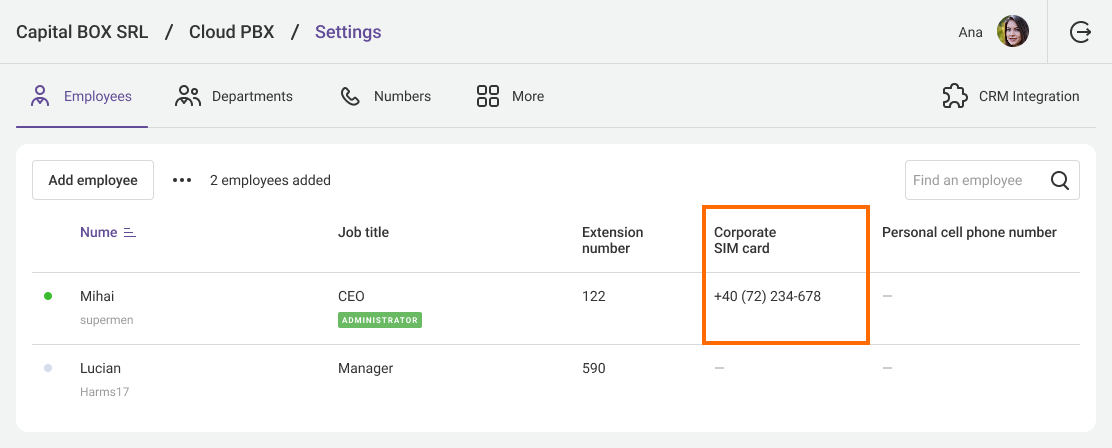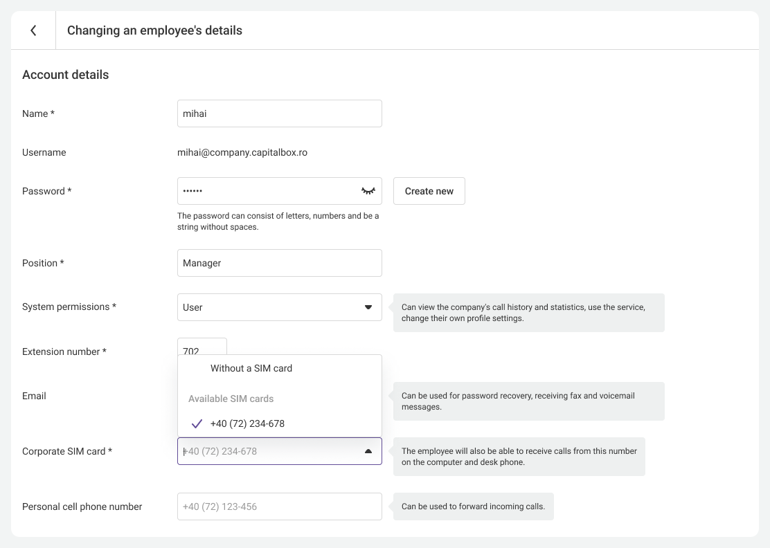 Only a user with the Administrator rights level can assign a corporate SIM card to an employee. After that, the corporate SIM card will immediately become the employee's personal number in Cloud PBX.