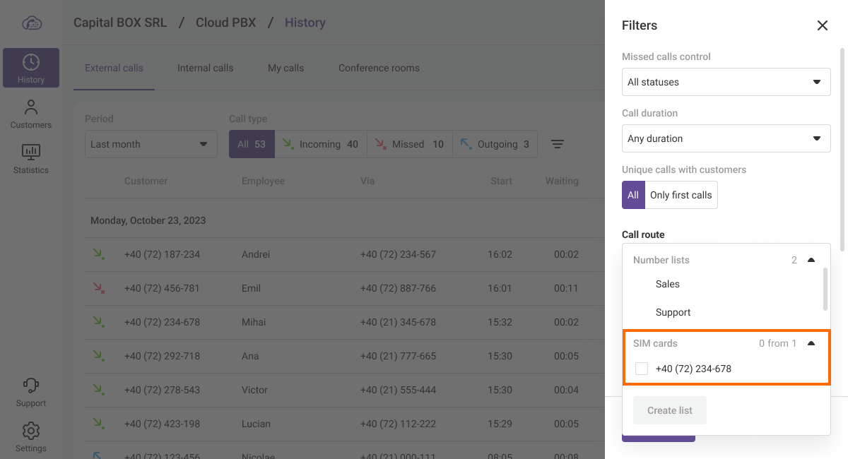 In History and Statistics, all incoming calls to a corporate SIM card number can be viewed separately from other calls. In the Via number filter, corporate SIM cards are grouped in a separate section.