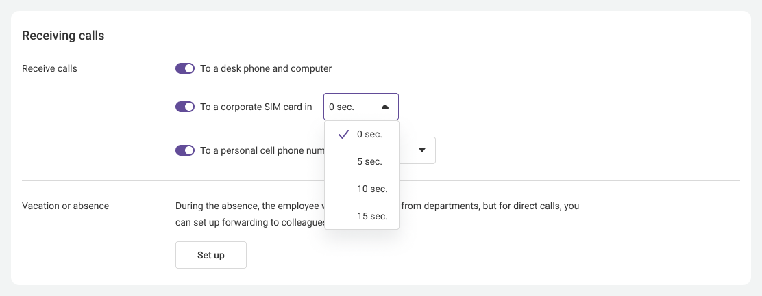 3. When you select a corporate SIM card, it will automatically start receiving calls — the switch in the Receiving calls section will automatically move to the active position.