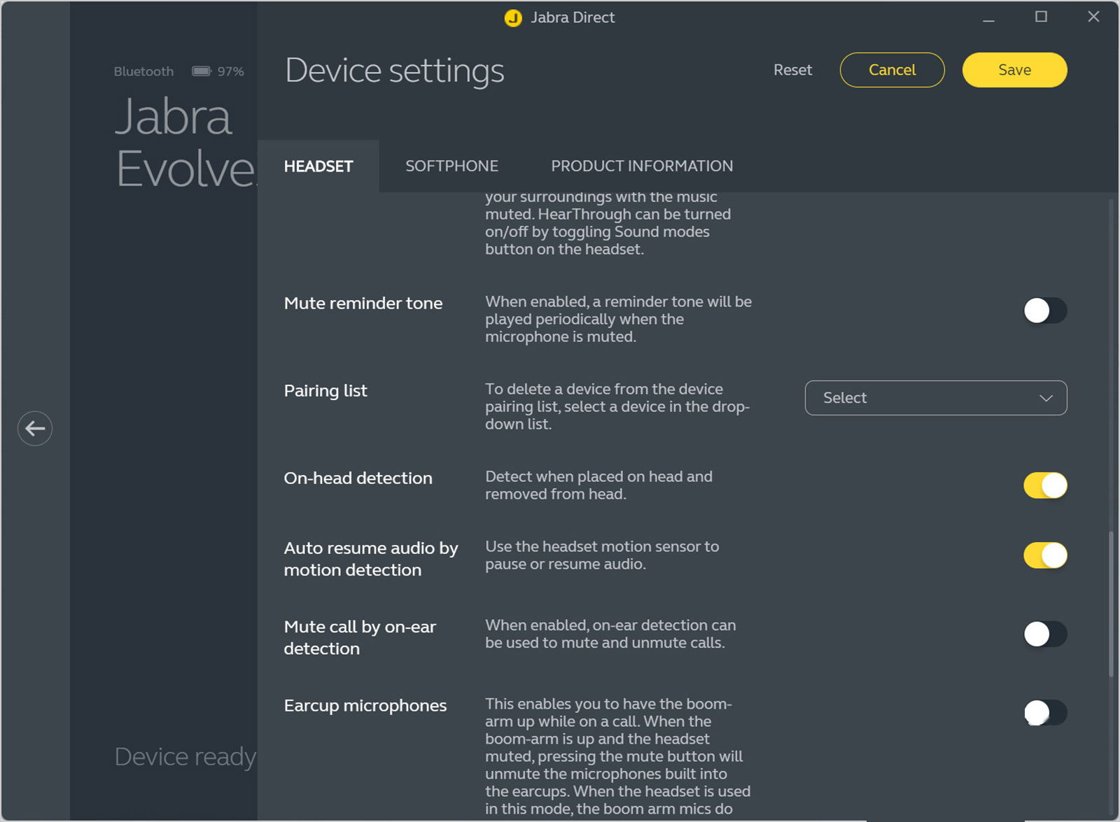 Jabra devices can be configured using the Jabra Direct utility, which can be downloaded from: https://www.jabra.com/software-and-services/jabra-direct.