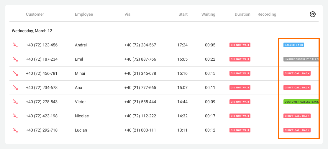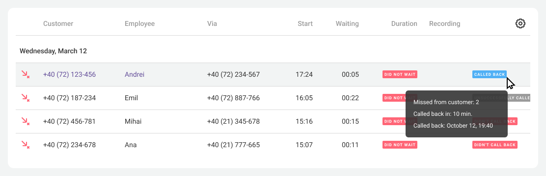 It is important for a manager to understand how managers handle missed calls —how many attempts it took to call back successfully, or if the customer was left with no answer.