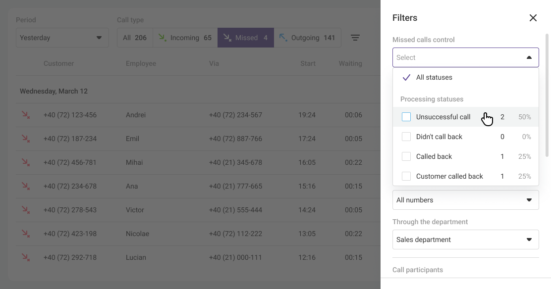 In History and Statistics of Cloud PBX you can monitor the processing of missed calls in real time and, based on this data, organize the workflow so that employees call customers back 100% of the time.
