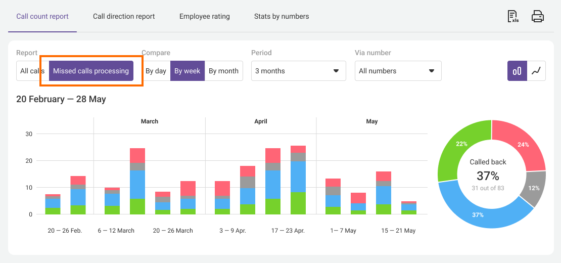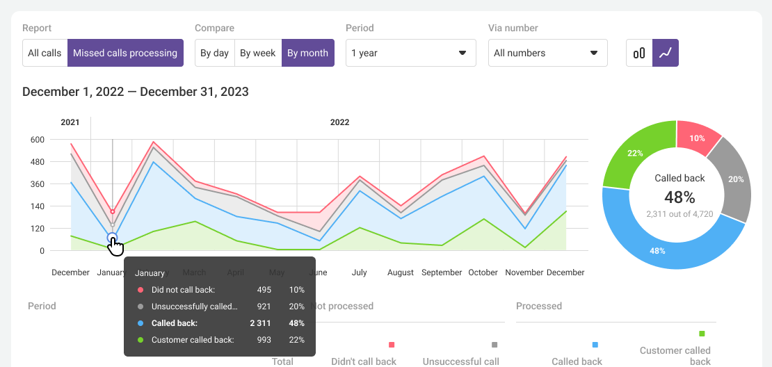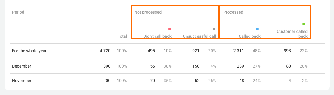 5. If you prefer working with numbers, use the data from the table below the graphs. All missed calls are conveniently divided into two columns — Unprocessed and Processed.