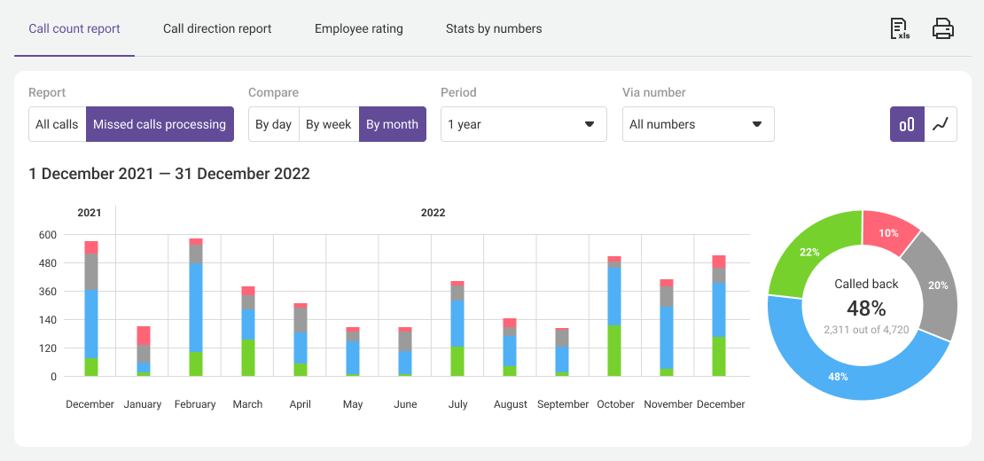 Thanks to data visualization, you will be able to evaluate how the ratio of processed and unprocessed missed calls changes over a selected period and organize the activity of employees so that they work more effectively during various force majeure events.