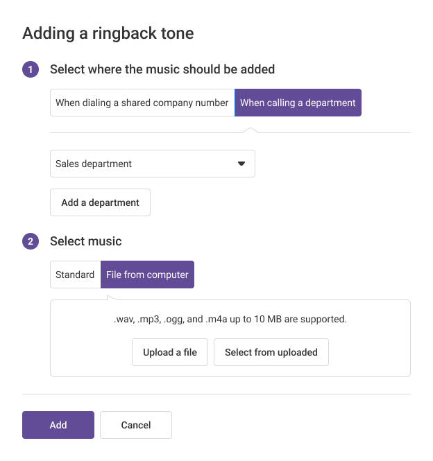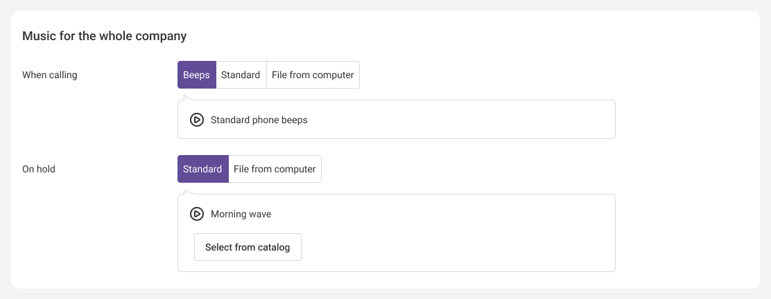 In the catalog of standard melodies, you can choose the music that will play when calling company numbers and departments. Cloud PBX offers 7 standard melodies now.