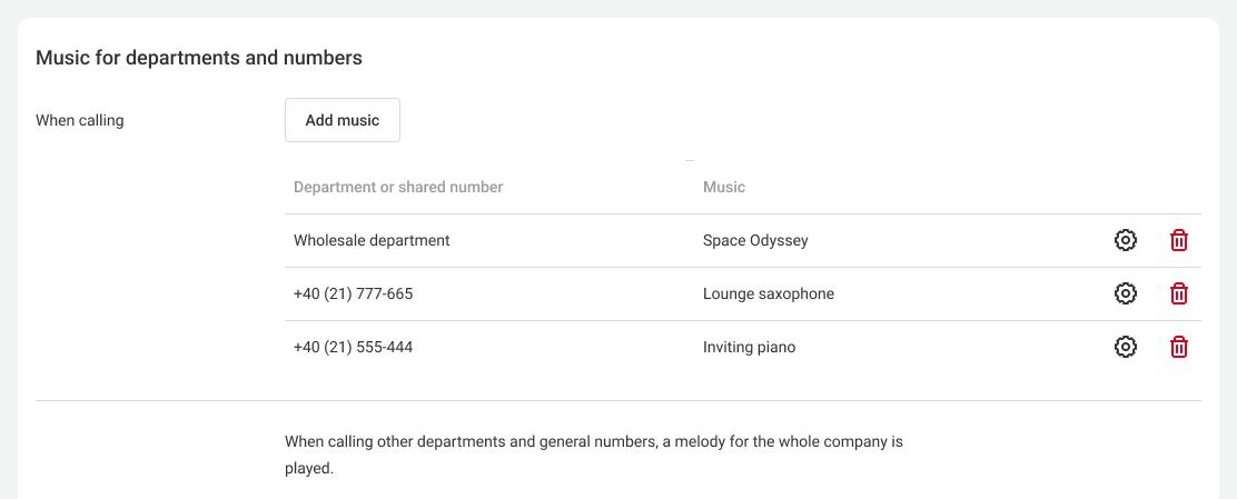 To change the music for a department, click the gear icon located to the right of the department name and music. To remove the music settings, click the trash bin icon.