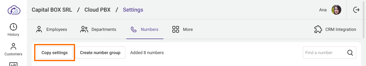 1. Go to the Settings section on the Numbers tab. Click the Copy settings button.