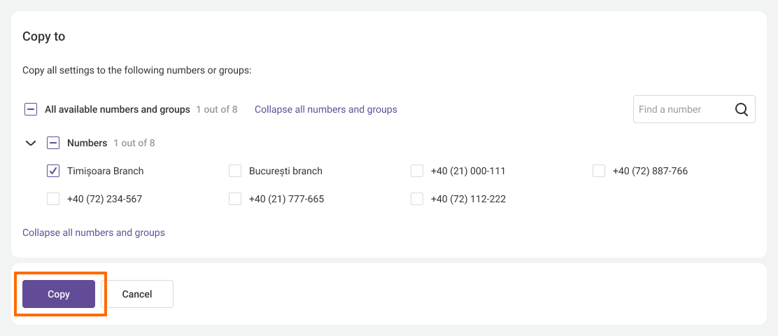 4. Check the boxes where you want to copy the number settings to. You can copy the settings to individual numbers, as well as to groups of numbers.
