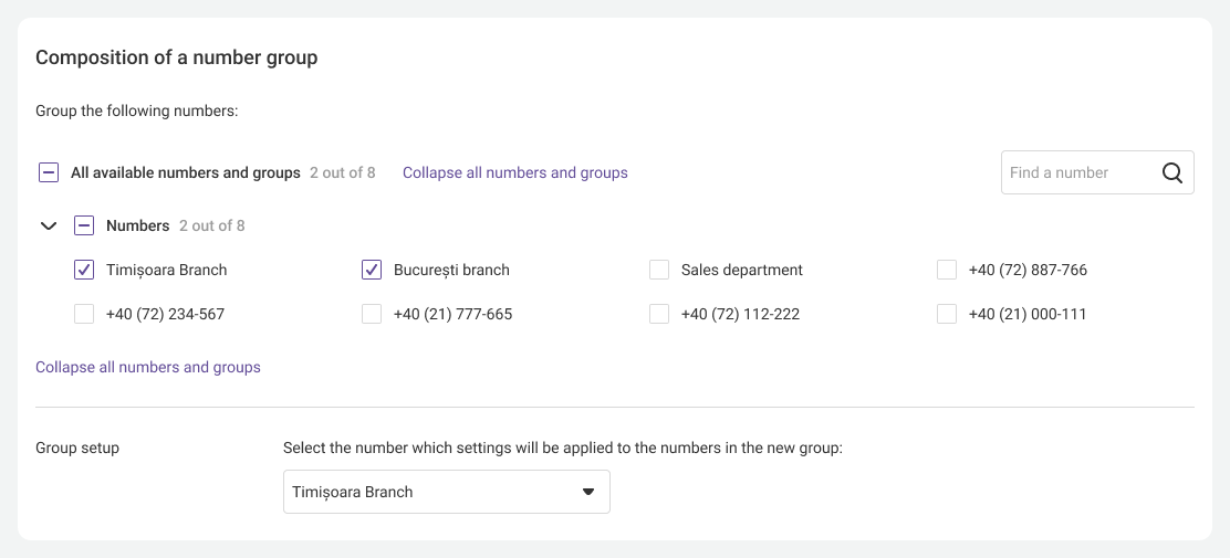 Only those numbers that are not already in other groups can be included in this group. If you want to add to the group all numbers that are not in any of the previously created groups, click the checkbox next to the All available numbers heading.