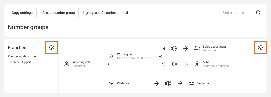 • if you need to change the rules for receiving calls, the schedule, the greeting in the number group, click on the gear icon to the right of the call reception scheme.