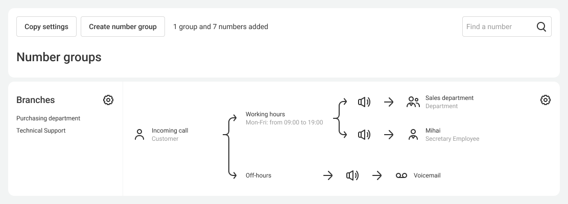 If you have many numbers that work the same way, you don't have to go into the settings of each number separately to change the schedule or greeting. Cloud PBX allows you to save time and edit any amount of numbers in bulk — you can combine numbers into groups with the same settings or copy the number settings.