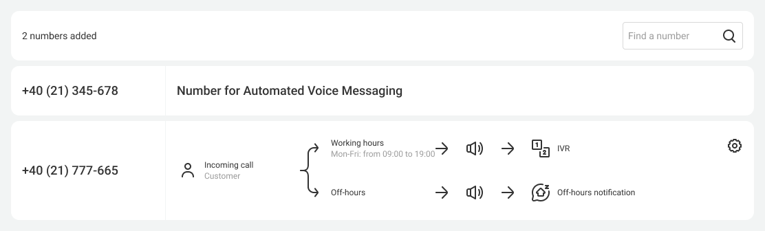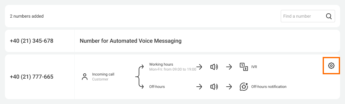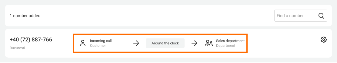1. Go to the Numbers tab in the Settings section to see a current call-receiving scheme for your numbers.