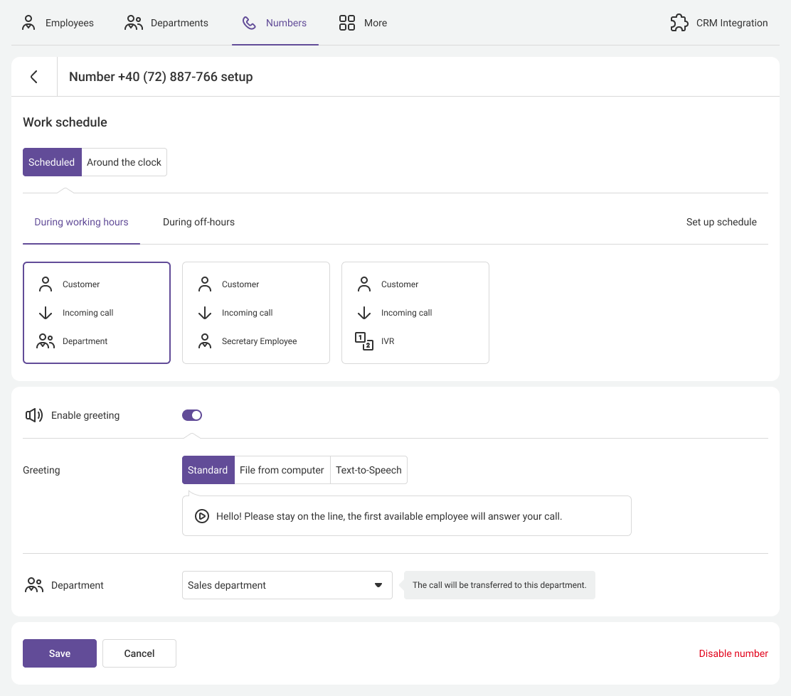 During working hours, a call can be forwarded to a department, an employee, or an interactive voice response (IVR). You can use a default voice greeting, upload your file, or synthesize speech in Cloud PBX.