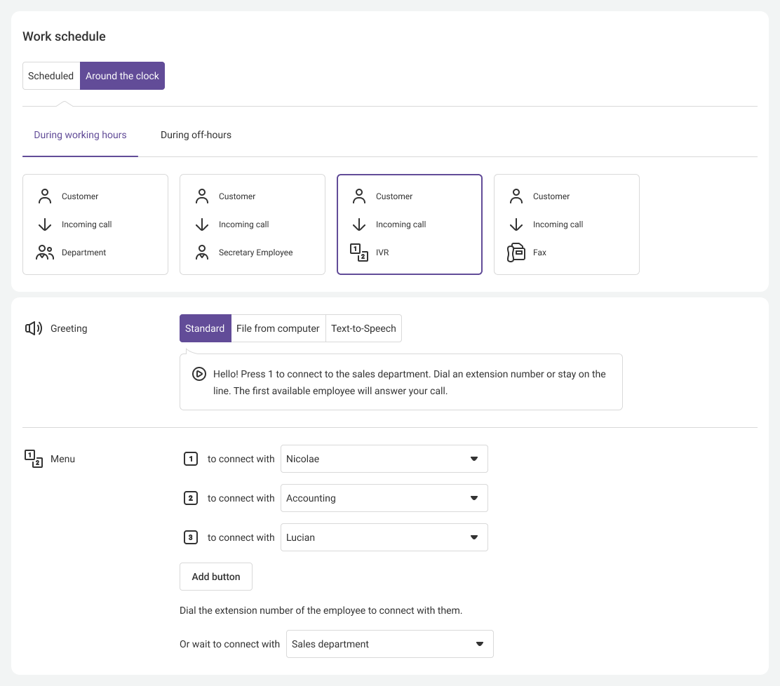 If you receive customer calls around the clock, you can direct them to a department or secretary, redirect them to a fax machine, or provide a customer with an IVR to choose whom to speak with. In the last option, you must set up commands for multiple buttons.
