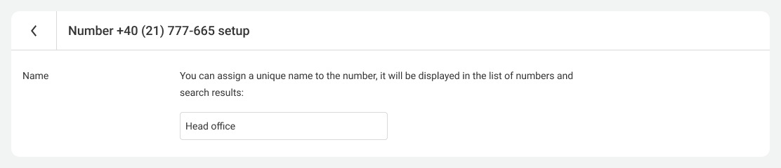 On the number settings page, enter a unique name. It should be short (no more than 60 characters) and informative. For example, “Berlin Office” or “Sales Department.” At the bottom of the page, do not forget to click Save.