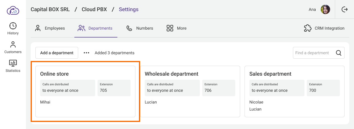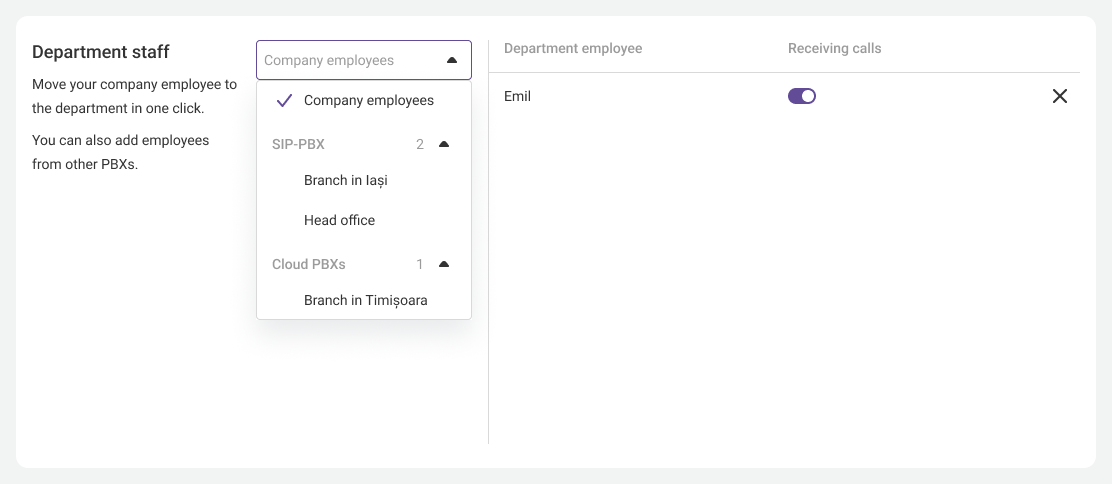 2. In the Department staff section select the required office or Cloud PBX from the drop-down list.