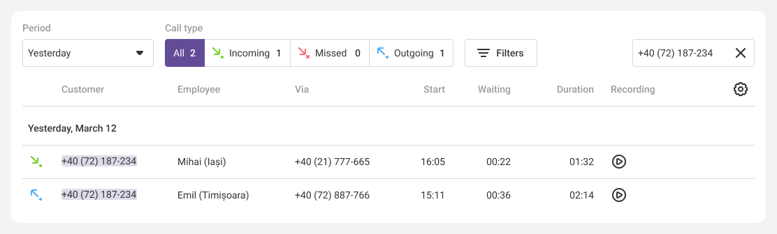 Now, your department calls, which were received or made by an employee from another PBX, will be displayed in your History and their recordings can be listened to. In the Employee column, the name of the branch to which the employee belongs will be displayed in brackets, and in the Via column — the number of the Cloud PBX in which the department with this manager is set up.
