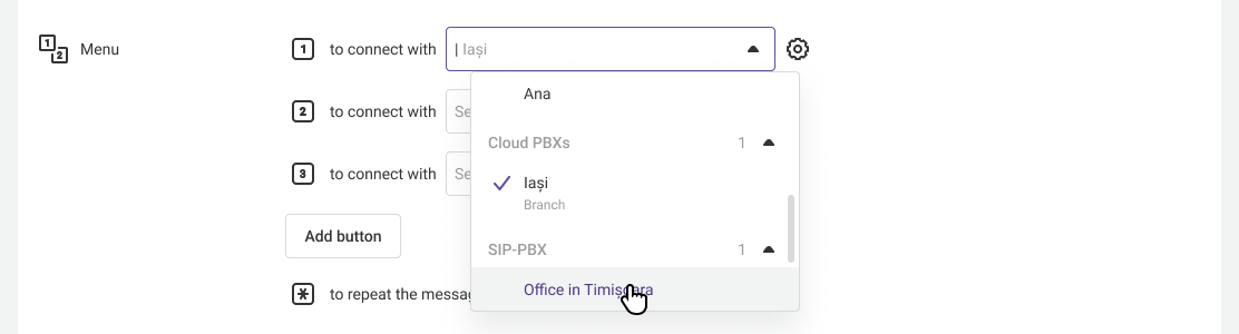 2. Open the drop-down list next to the button you want to assign to forward calls to an employee from another PBX. Find the Cloud PBX section in the list if you want to make an employee from another Cloud PBX available through the IVRu. If you want to add an extension number of a SIP-PBX employee, find the SIP-PBX section.