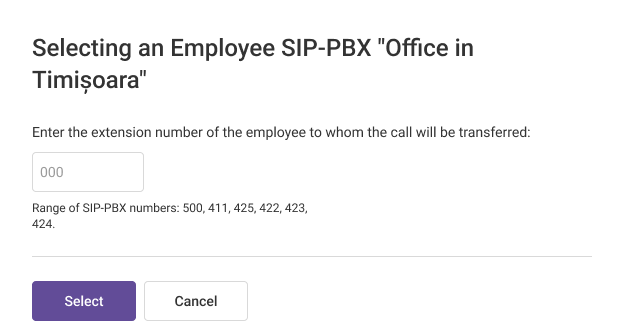 - If this is a SIP-PBX, then enter the employee’s extension number. So that you do not have to look for this number in the SIP-PBX settings, the entire range of available numbers for the selected PBX is listed under the number entry window.
