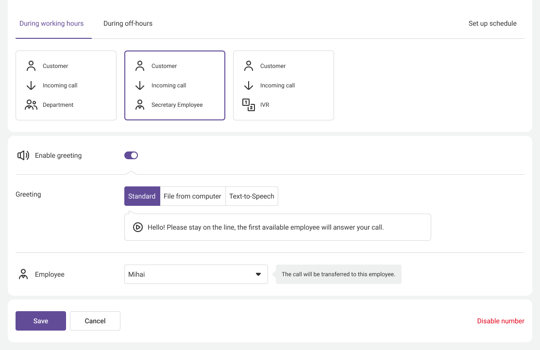 1. In the number settings select the Scheduled operating mode and go to the During working hours tab. Select the scenario: Customer — Incoming call — Secretary Employee.