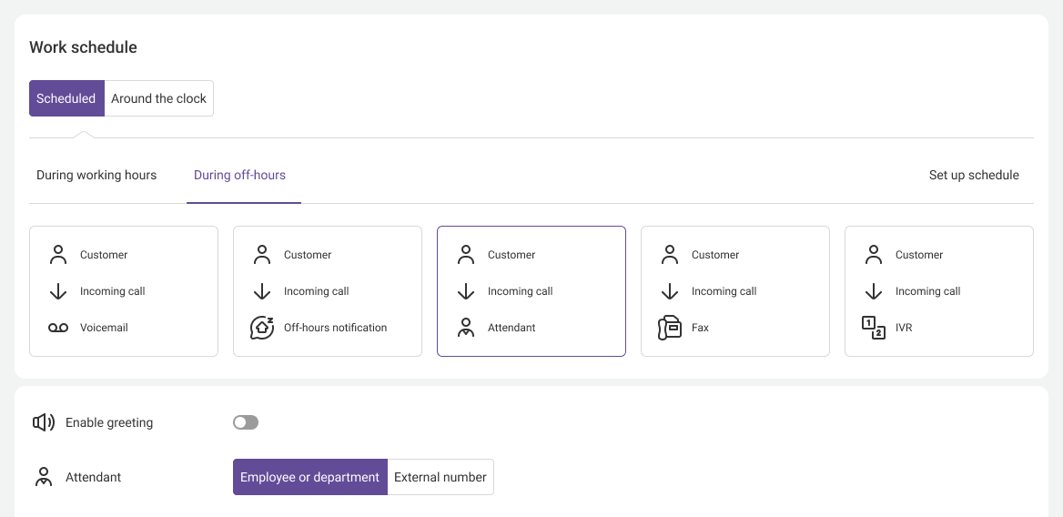 1. In the number settings, select the Scheduled operating mode and go to the During off-hours tab. Select the scenario: Customer — Incoming call — Attendant.
