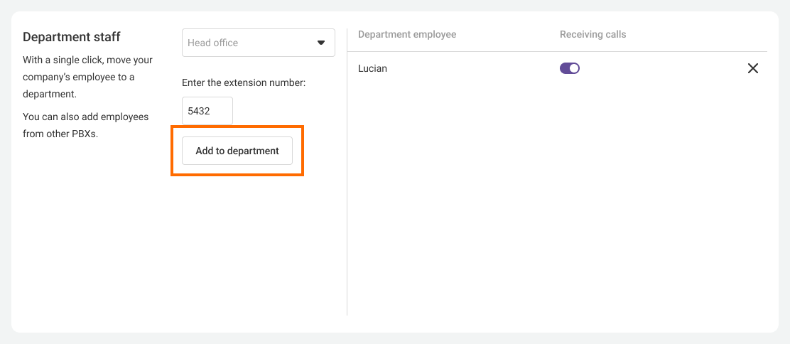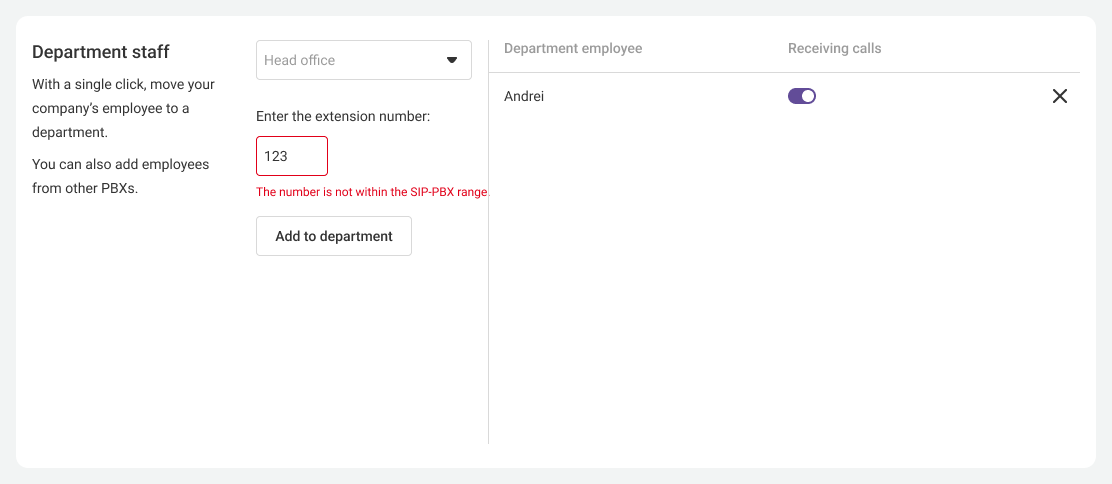 1. When you select a SIP-PBX, a window for entering an extension number will appear below. Enter the number of the employee you want to add and click the Add to department button.